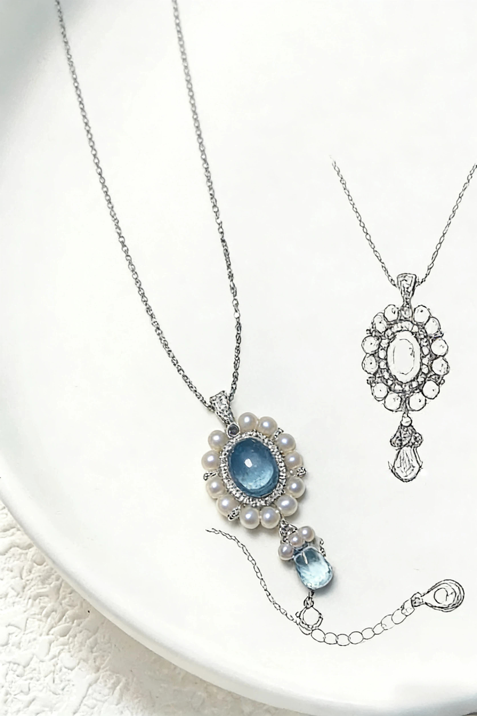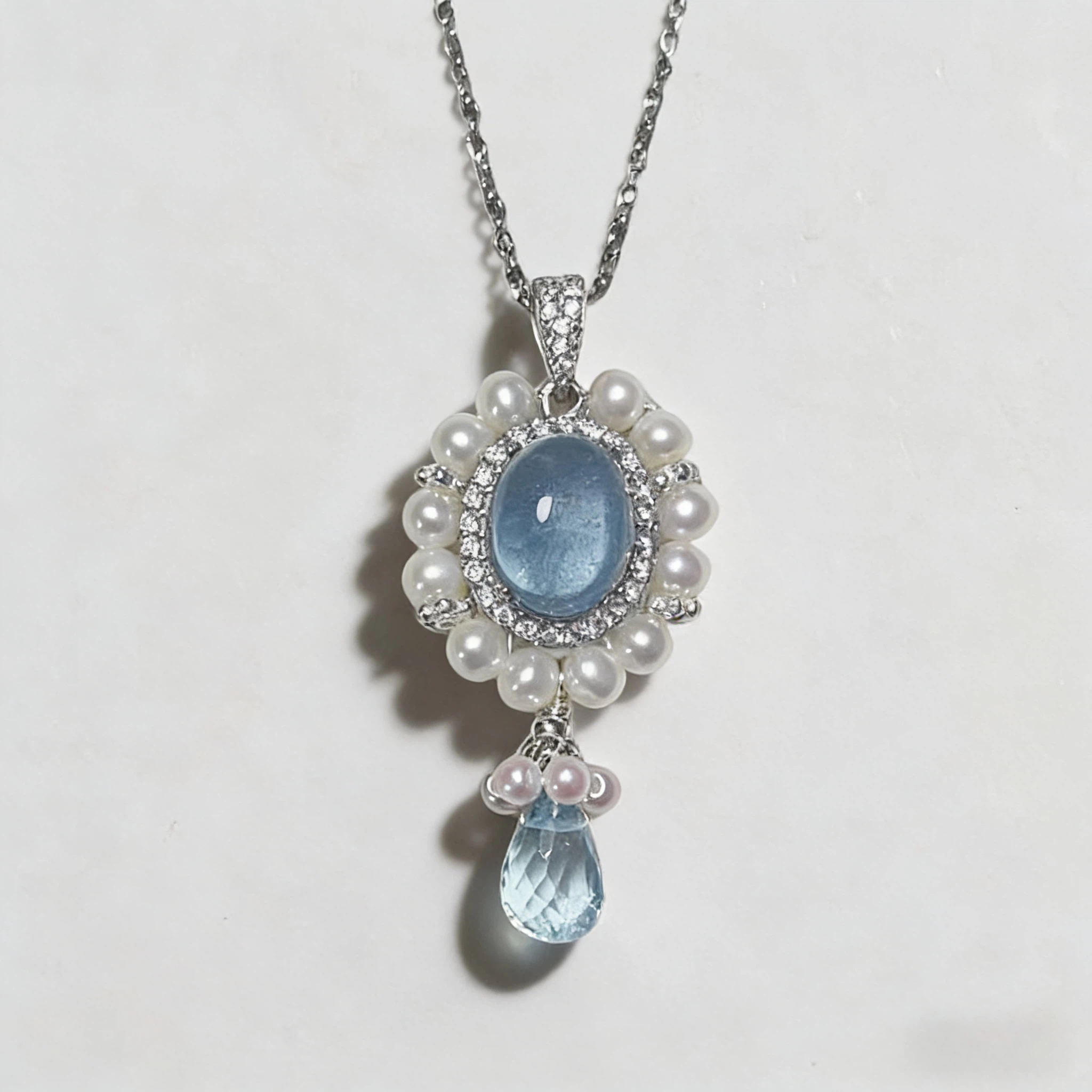 This handcrafted S925 sterling silver necklace features carefully selected natural Aquamarine crystals, Blue Topaz, and lustrous Freshwater Pearls—each gemstone is handpicked for its vibrant color and clarity, then polished to enhance its natural glow, making every piece truly one-of-a-kind.